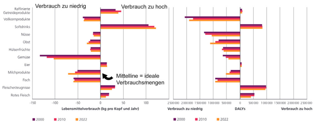 In den DALY gehen die verschiedenen Nahrungsmittel gewichtet ein. zB Eier mögen zwar für den TMREL zu viel verzehrt werden, für die Gesunderhaltung ist ihr Beitrag jedoch deutlich weniger negativ, im Gegensatz zu Fleischerzeugnissen.
